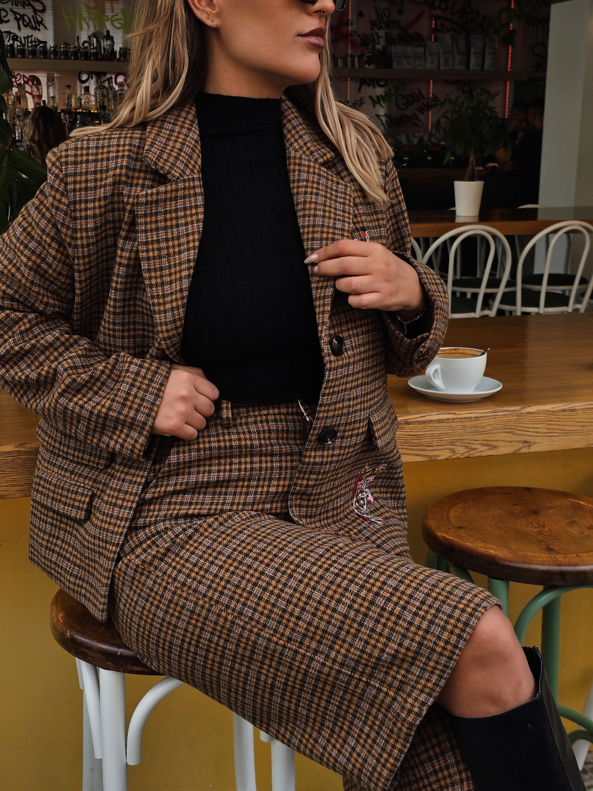 Αναδείξτε το στυλ σας με αυτό το κομψό καρό σακάκι σε γήινους τόνους. Ένα διαχρονικό κομμάτι που συνδυάζει την κλασική ραφή με τη σύγχρονη αισθητική, προσφέροντας κομψότητα και άνεση σε κάθε εμφάνιση.