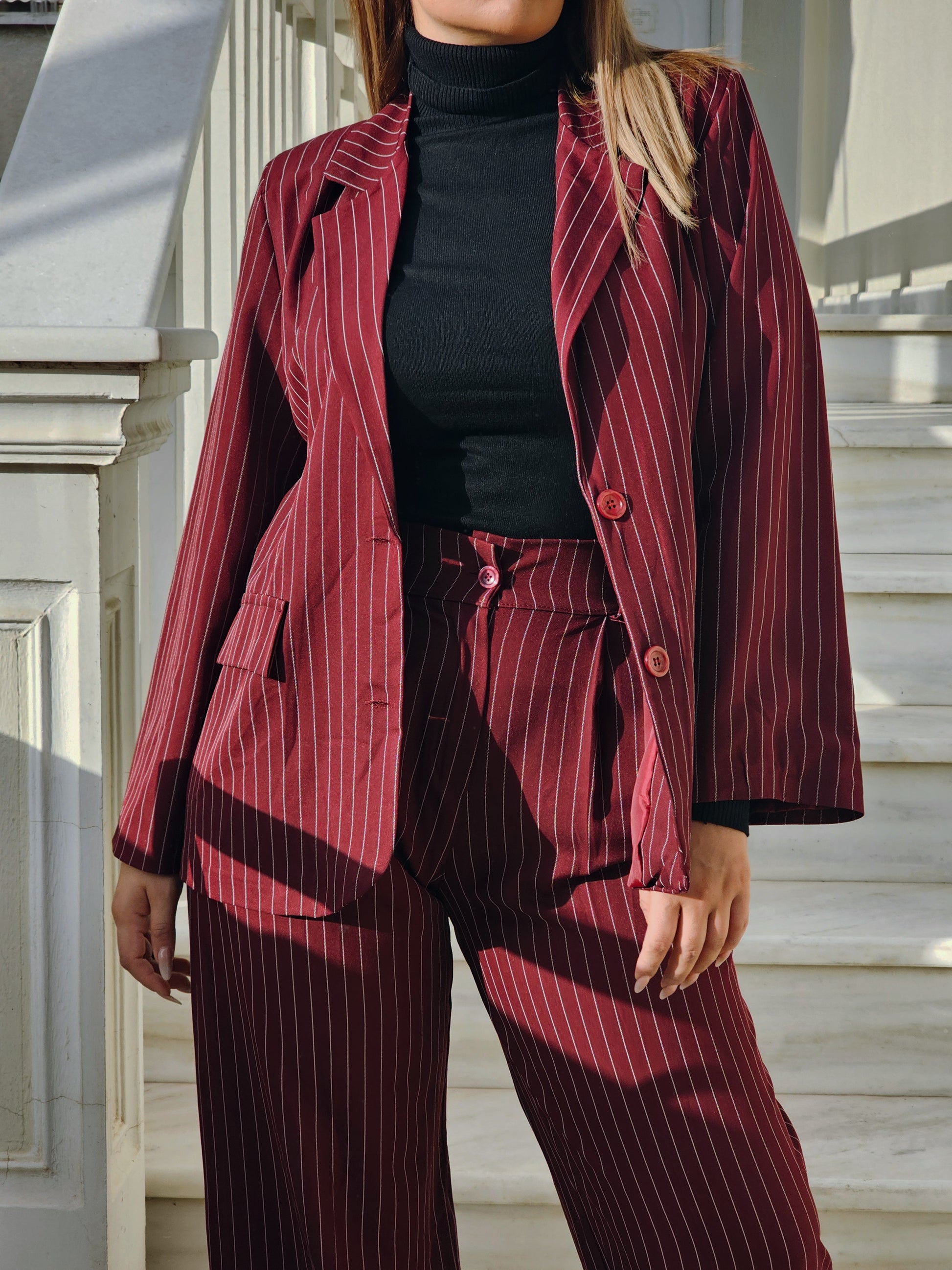 Αναβάθμισε το καθημερινό ή επαγγελματικό σου στιλ με αυτό το κομψό γυναικείο σετ κοστουμιού με διακριτική κάθετη ρίγα. Ο σχεδιασμός του προσφέρει μια σοφιστικέ, επιμηκυντική γραμμή που κολακεύει κάθε σιλουέτα, ενώ παραμένει άνετο για όλη τη διάρκεια της ημέρας.