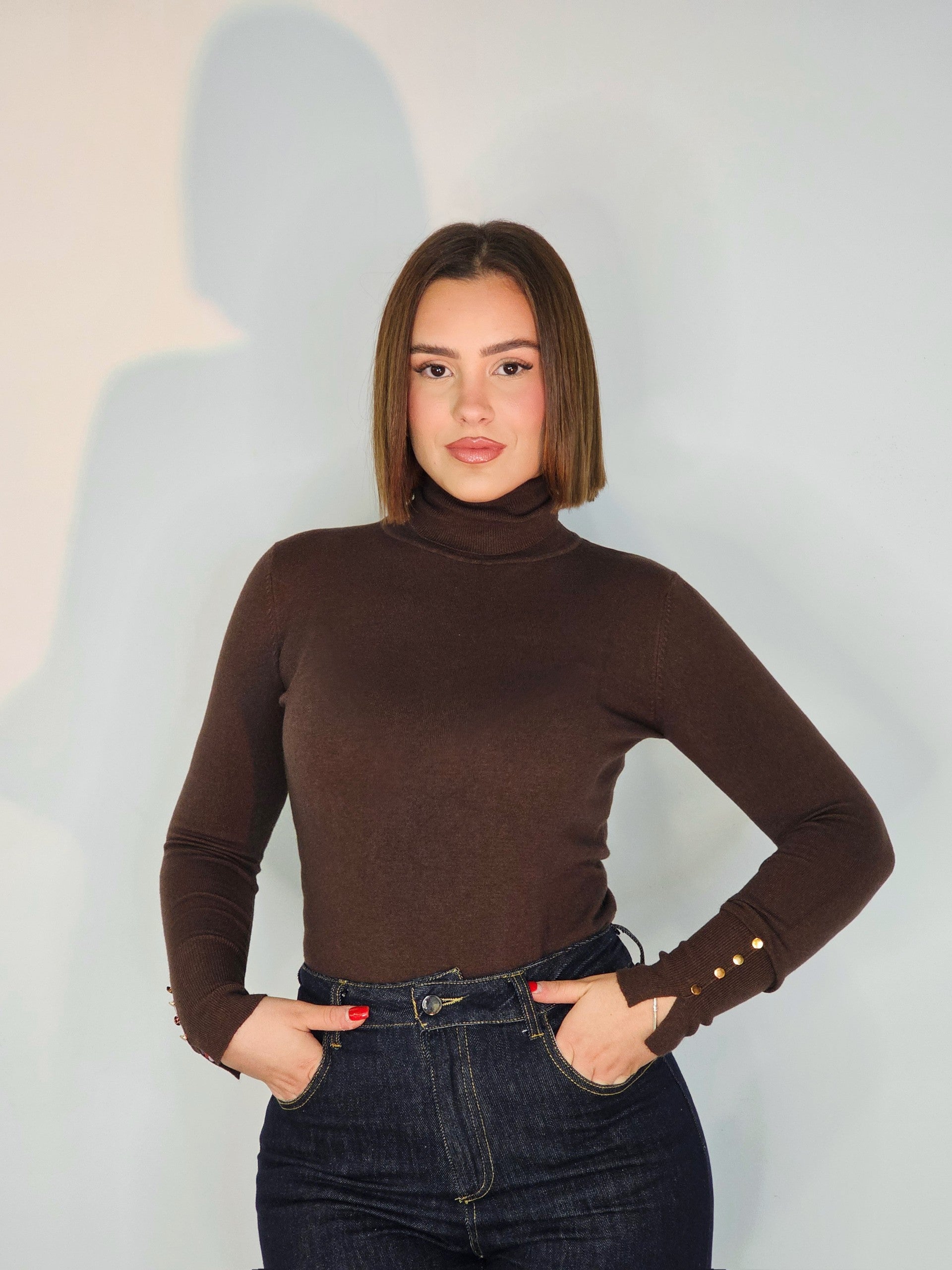 Διαθέτει μακριά μανίκια με διακοσμητικά κουμπιά στο τελείωμα, προσθέτοντας μια εκλεπτυσμένη λεπτομέρεια που το κάνει να ξεχωρίζει. Το ύψος του λαιμού προσφέρει στυλ και προστασία από το κρύο, ενώ η υψηλής ποιότητας ύφανση εξασφαλίζει άψογη εφαρμογή χωρίς να διαφανίζει.