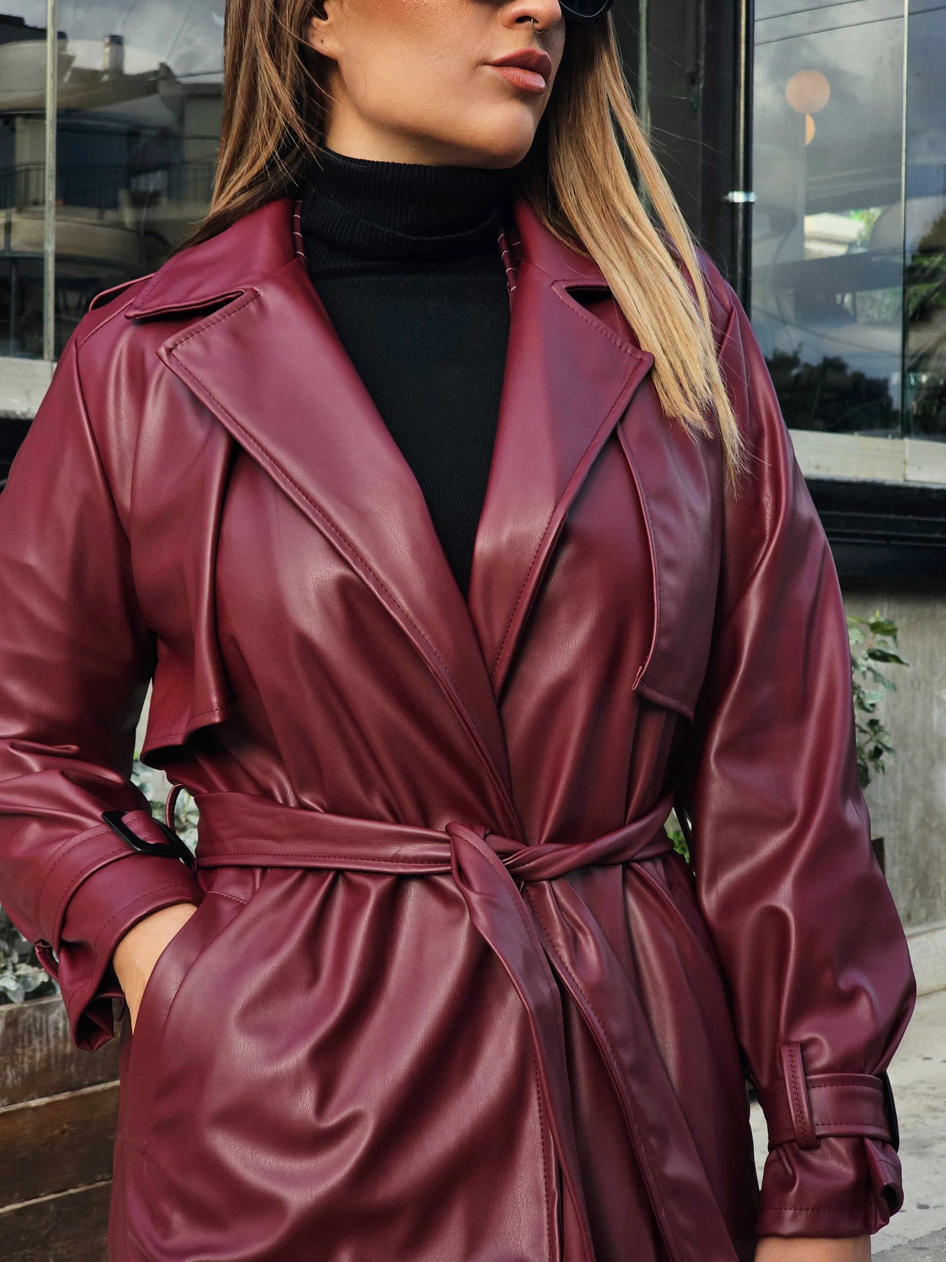 Αναβάθμισε το στυλ σου με αυτή τη statement καπαρντίνα από υψηλής ποιότητας οικολογικό δέρμα σε βαθύ μπορντό χρώμα και ζεστό καφέ. Ο διαχρονικός της σχεδιασμός συνδυάζεται με μοντέρνες λεπτομέρειες, δημιουργώντας ένα κομμάτι που αναδεικνύει κάθε εμφάνιση – από πρωινή έως βραδινή.
