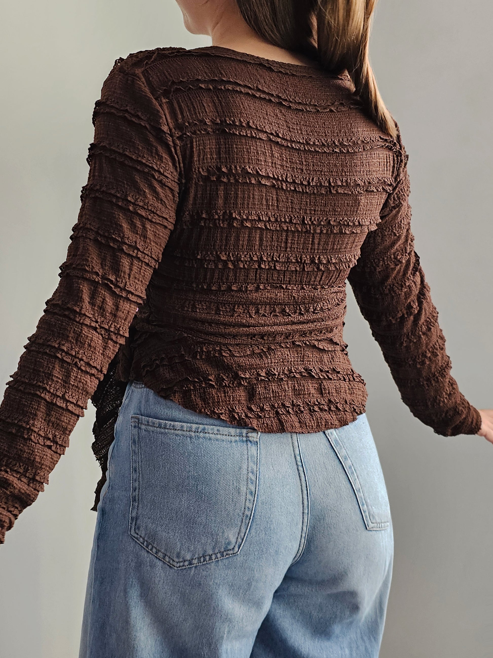 Ανανέωσε το καθημερινό σου ντύσιμο με αυτή τη θηλυκή wrap μπλούζα, διαθέσιμη σε τρεις υπέροχες αποχρώσεις: μαύρο, μπορντό και καφέ. Το ιδιαίτερο ανάγλυφο ύφασμα με επίπεδα βολάν χαρίζει μοναδική υφή και κίνηση, ενώ η κρουαζέ εφαρμογή τονίζει τη μέση και κολακεύει κάθε σιλουέτα.