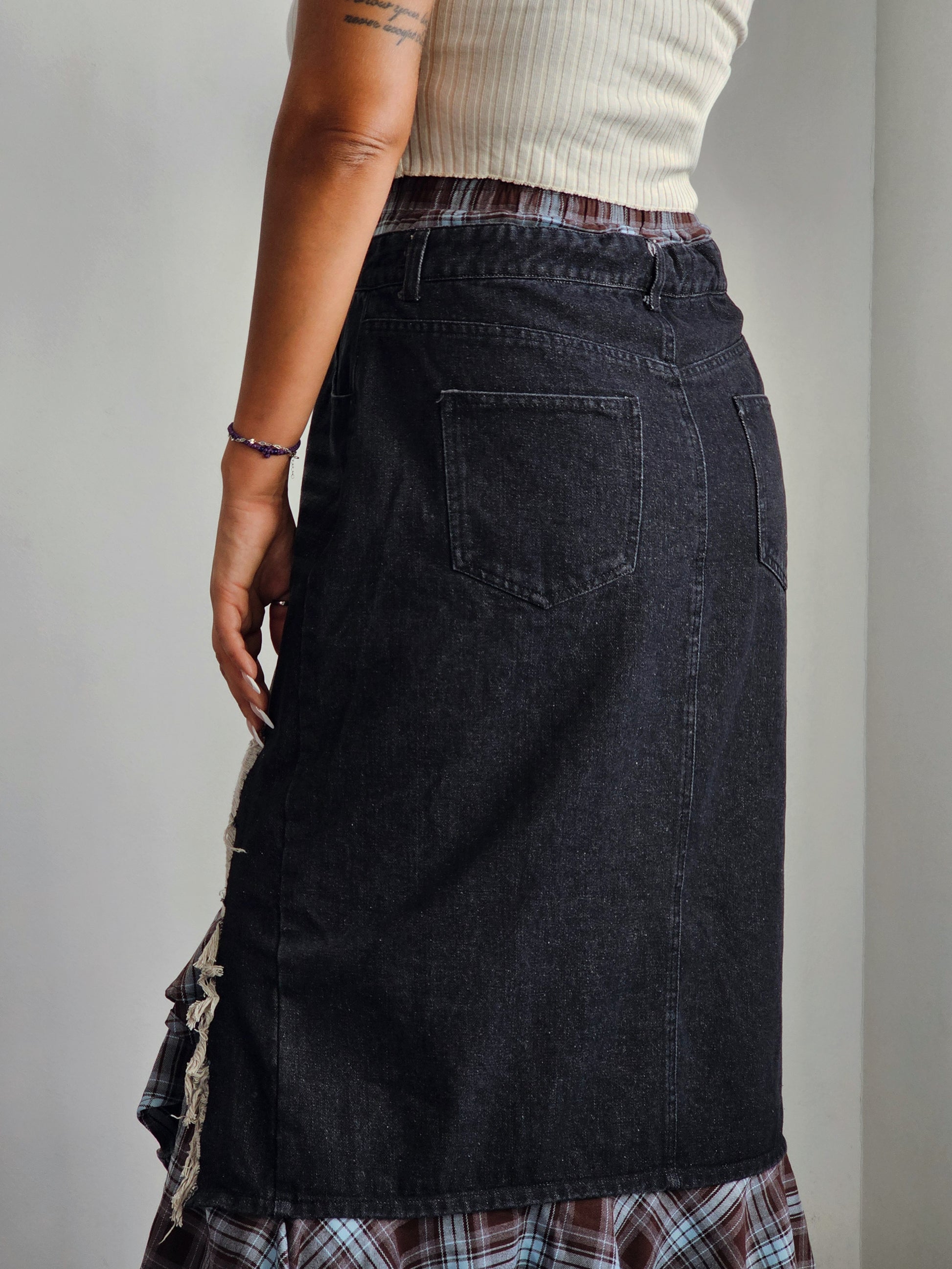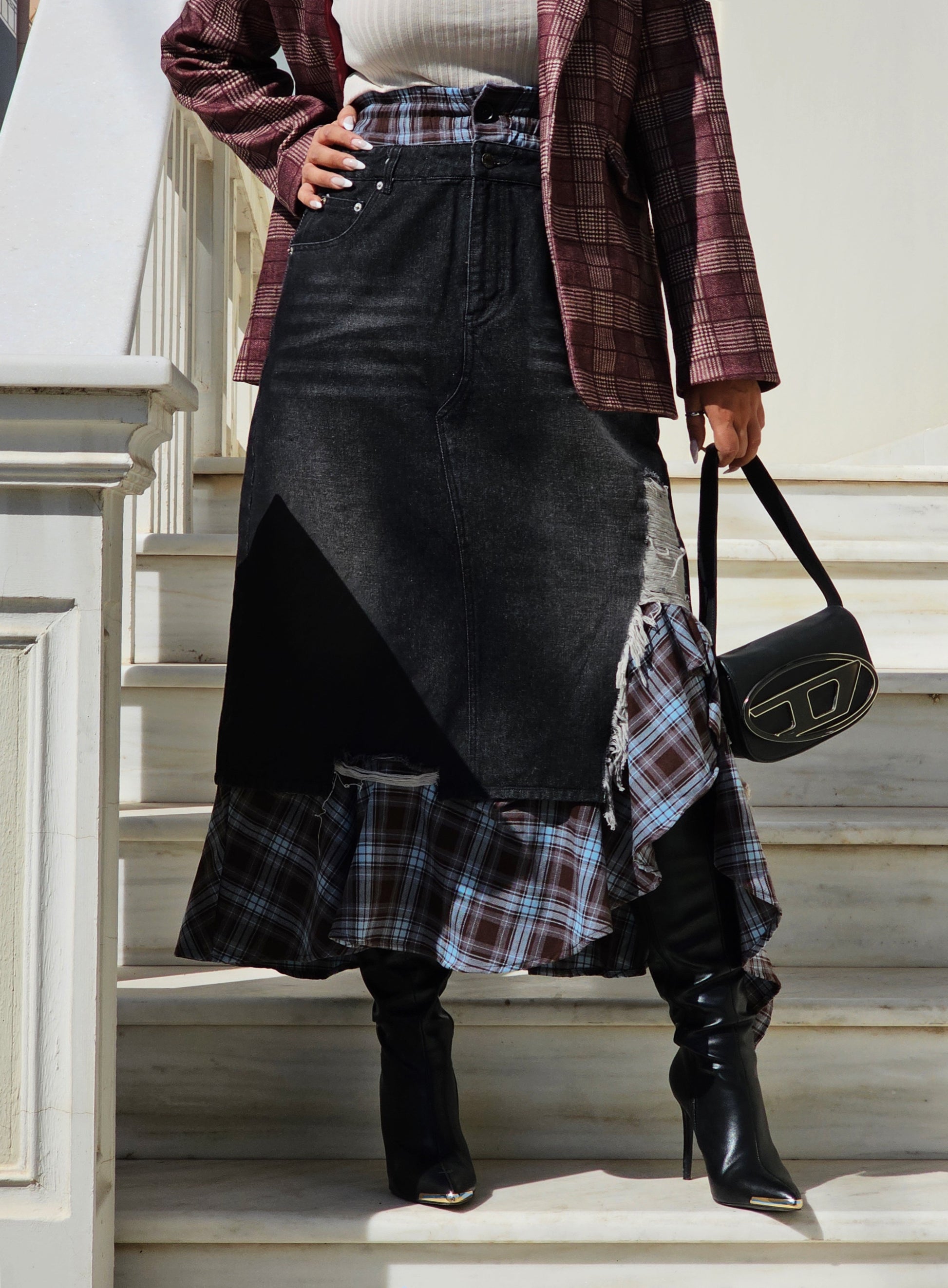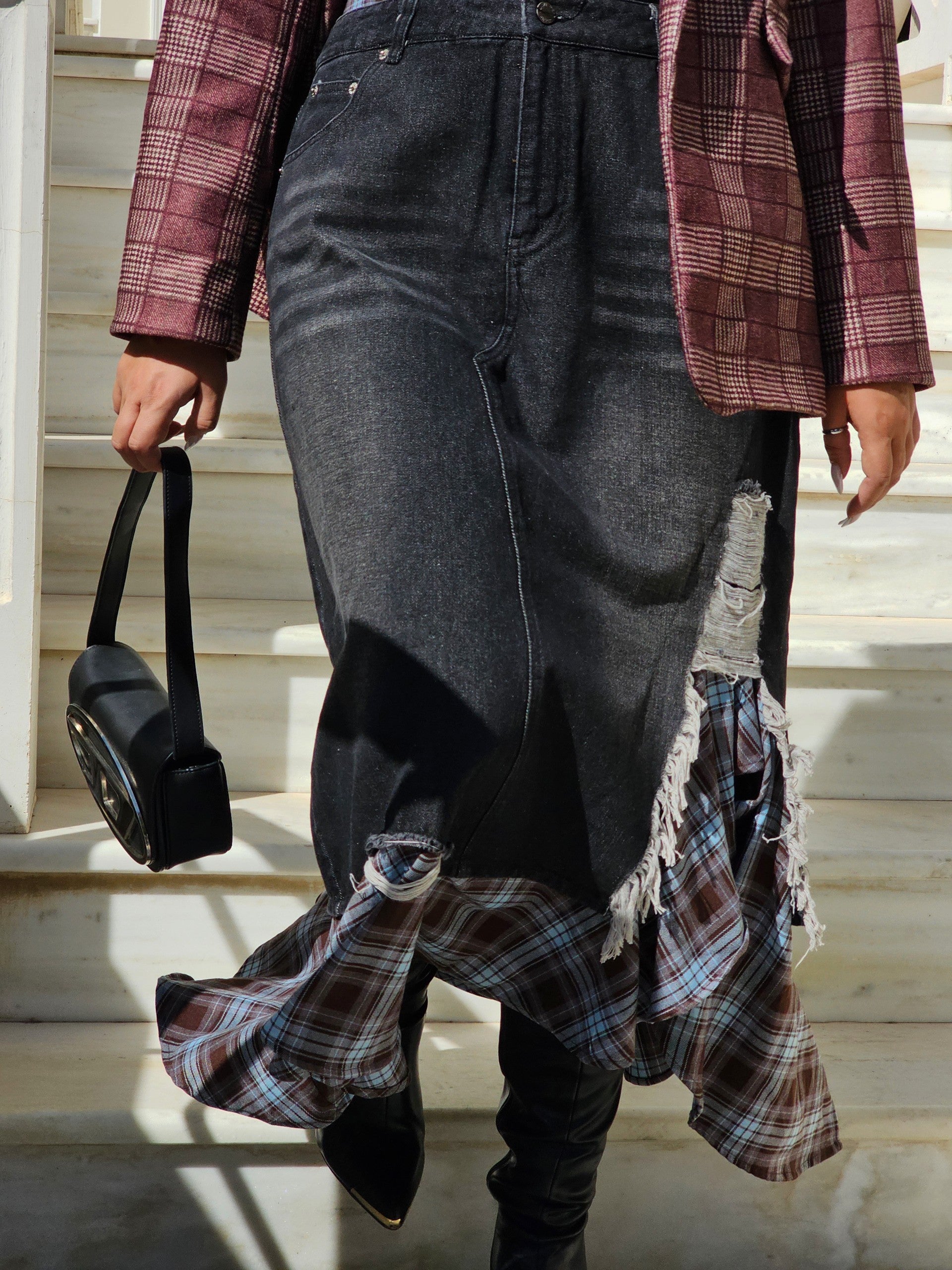 Ανανέωσε το στυλ σου με αυτήν τη μοναδική μαύρη denim φούστα με καρό λεπτομέρειες. Ένα κομμάτι που συνδυάζει την αυθεντικότητα του τζιν με το urban-chic ύφος του καρό υφάσματος, δημιουργώντας ένα look που δεν περνά απαρατήρητο.